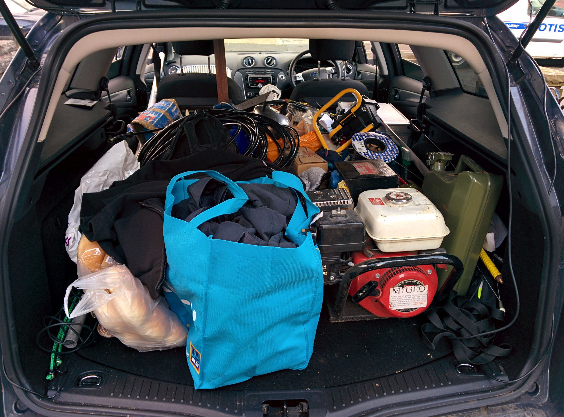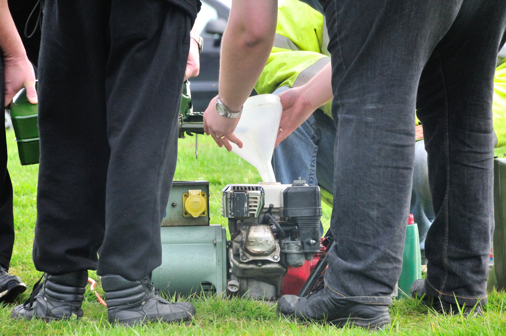 Some preventative maintenance on the generator during the weekend; Here Graham M0PAX and George fill the generator with fuel, while Spencer checks the oil level.