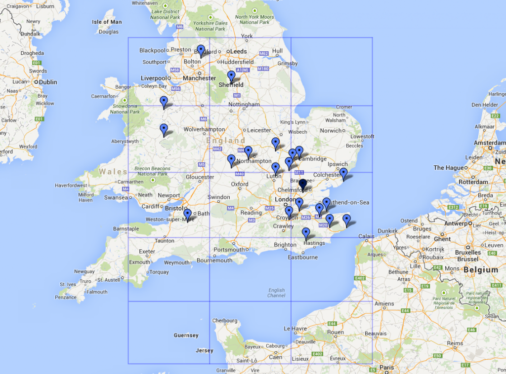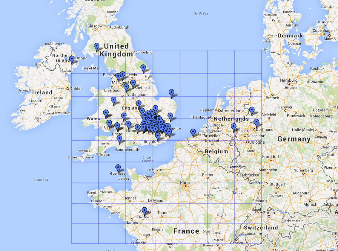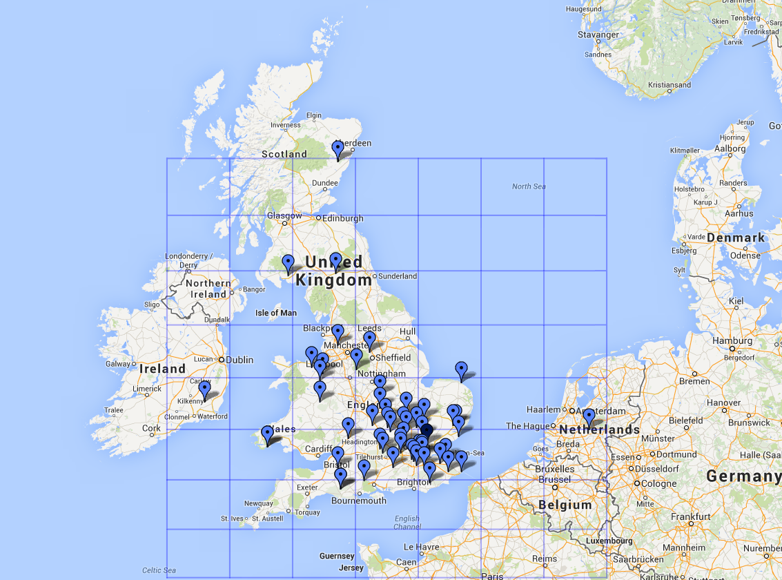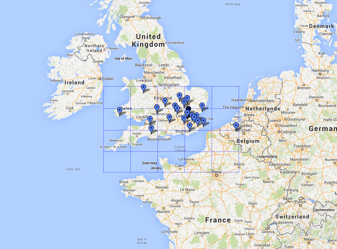 VHF NFD 2014During the 24 hours of activity, starting 2pm UTC on Saturday, we managed to rack up 20 QSOs on 50 MHz, 53 QSOs on 70 MHz, 76 QSOs on 144 MHz and 24 QSOs on 432 MHz (173 QSOs total). Maps of the QSOs made are shown below for the 4 bands.