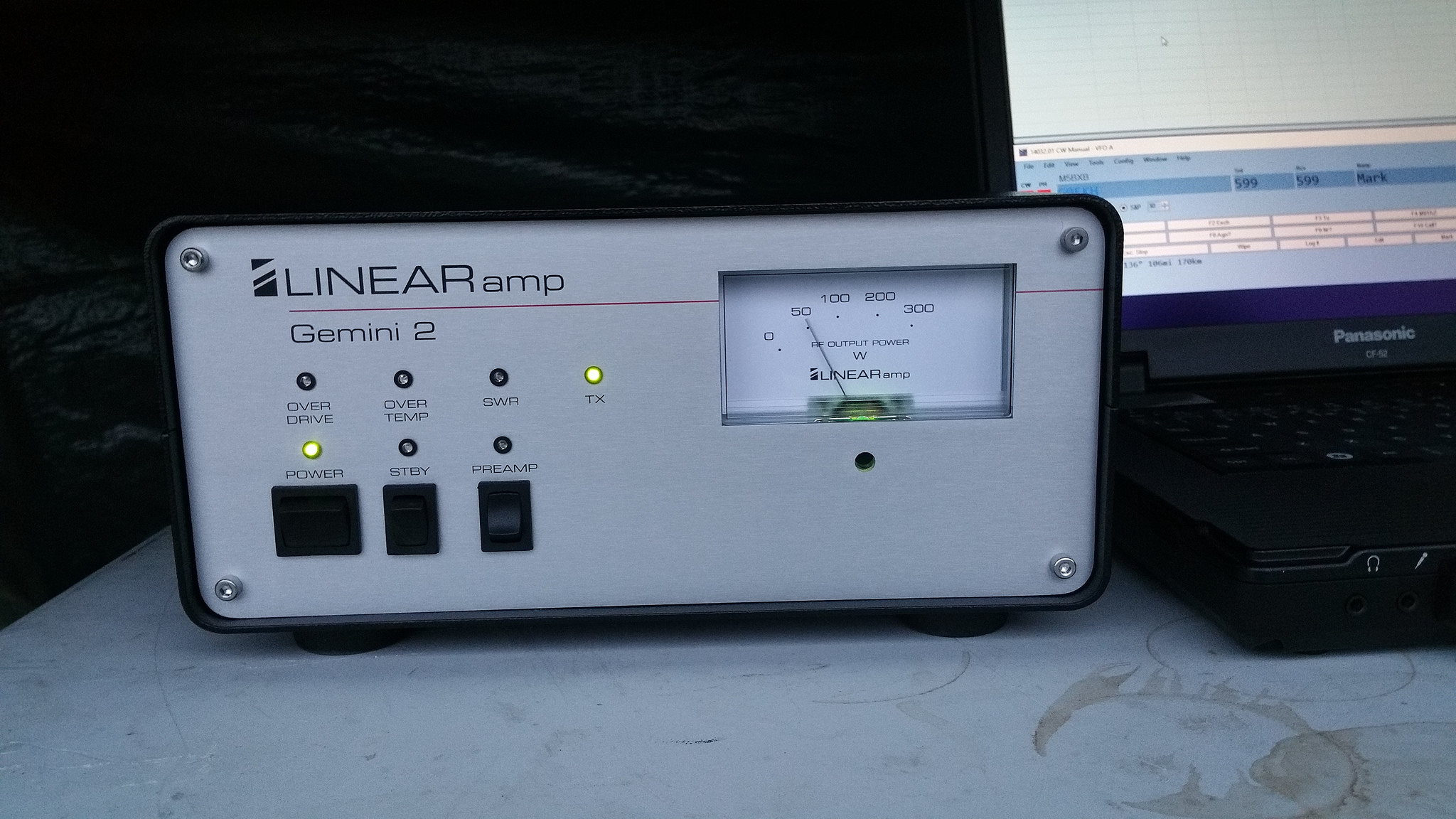 Icom 7100, 9e Portable Tona and RF power was provided by a Linear Amp 300w solid state amplifier. The mast was a Racal PU 12 at 5m as the band was wide open with tropo propagation, this provided some interested DX. Mains power was provided by a silent running 2KW Honda generator.