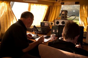 Taken just as the sun was setting, the two large antennas can be seen with the club caravan and members vehicles. The black dot suspended above the caravan is part of the 40 metre dipole configured as an inverted-V.