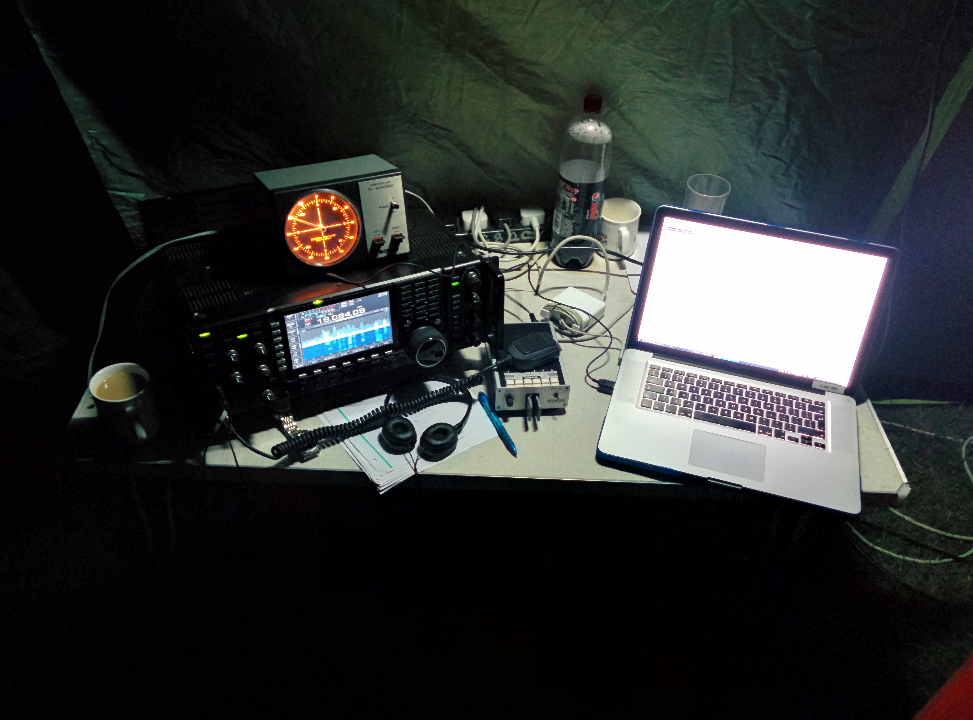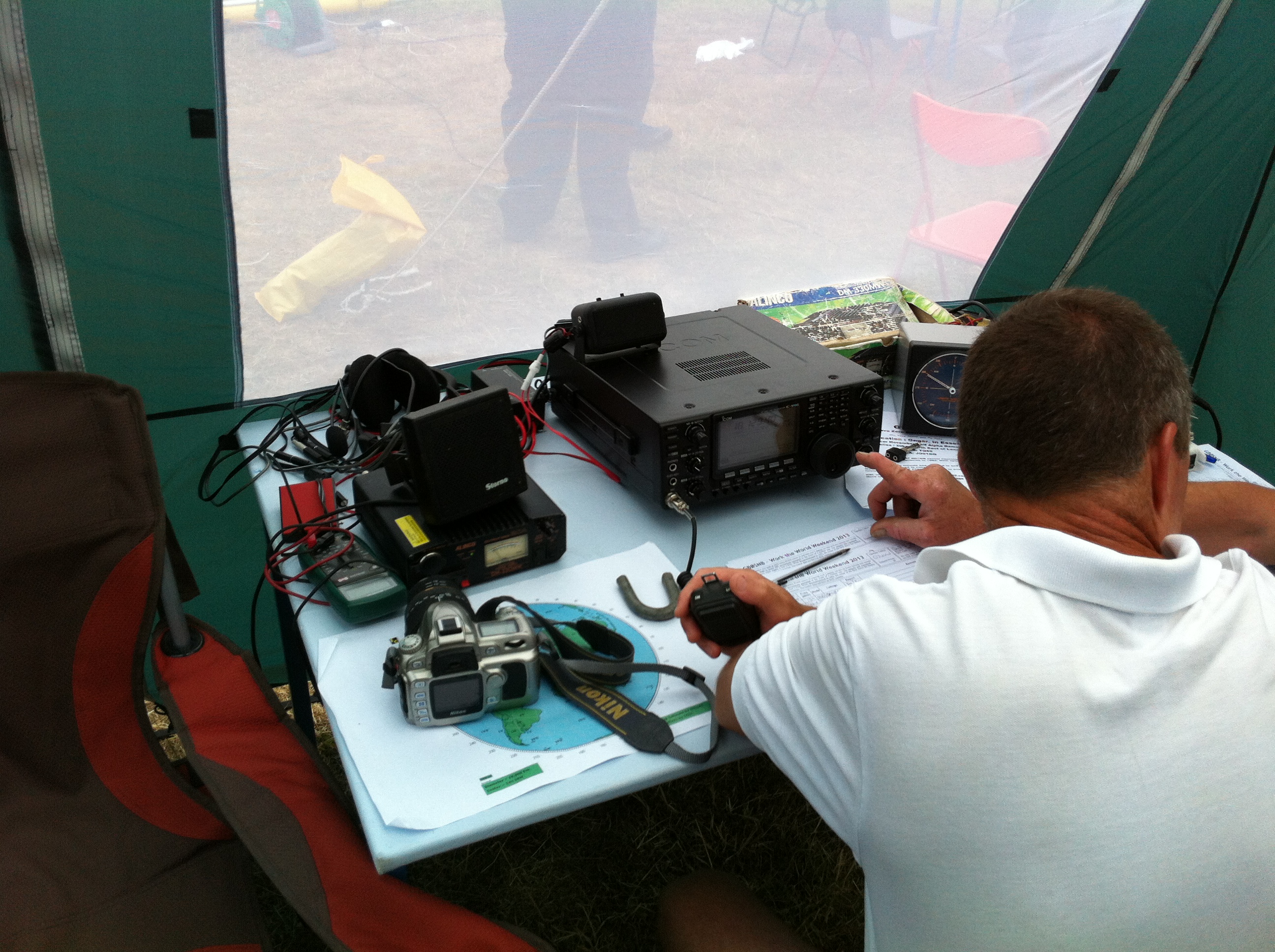 Here you can see the 17 metre station, consisting of an Icom IC7700 with logging laptop, tea mugs, paddle and microphone all cosily settled inside the club tent.
