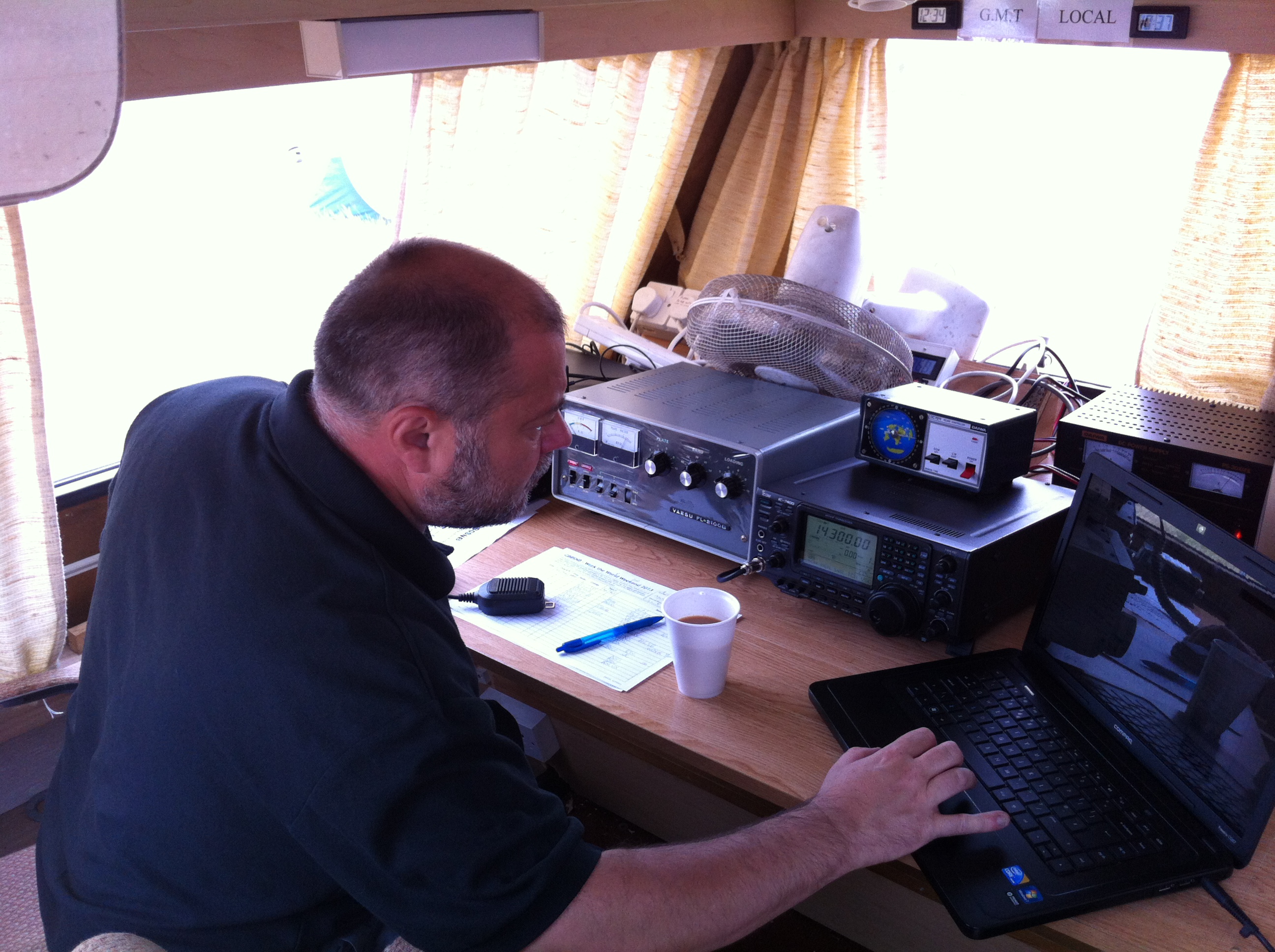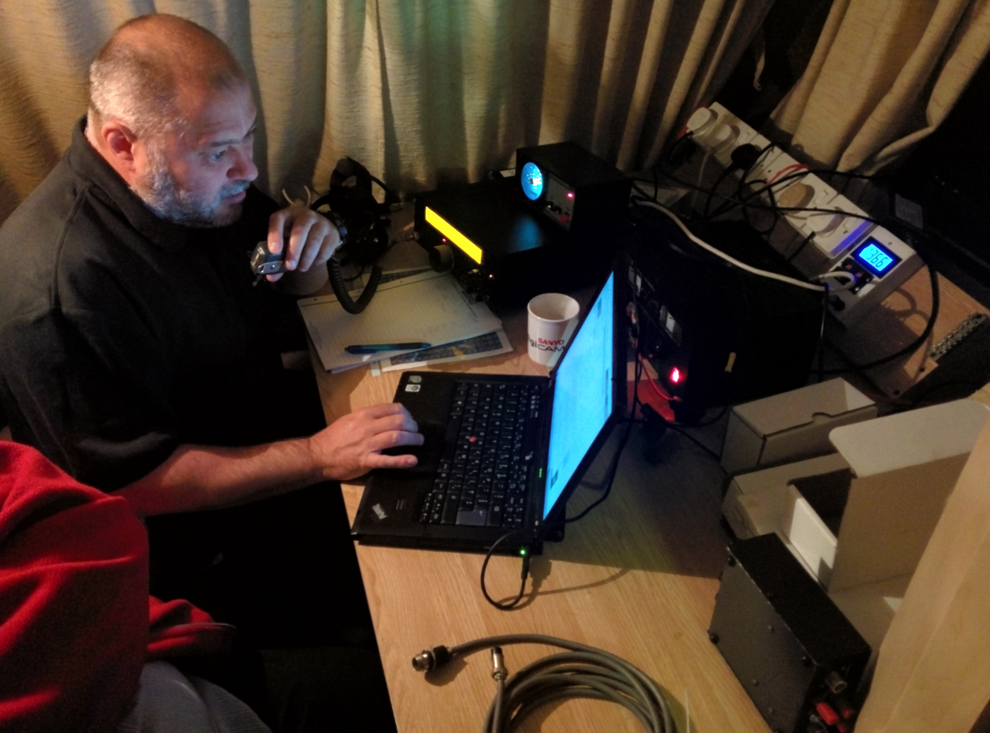 Meanwhile, Dave M0TAZ operates with relative comfort inside the club caravan. He’s using a Kenwood TS590s on 40 metres with the dipole, managing the massive pileup. He was alternating between 20 metres and 40 metres, SSB and data modes.