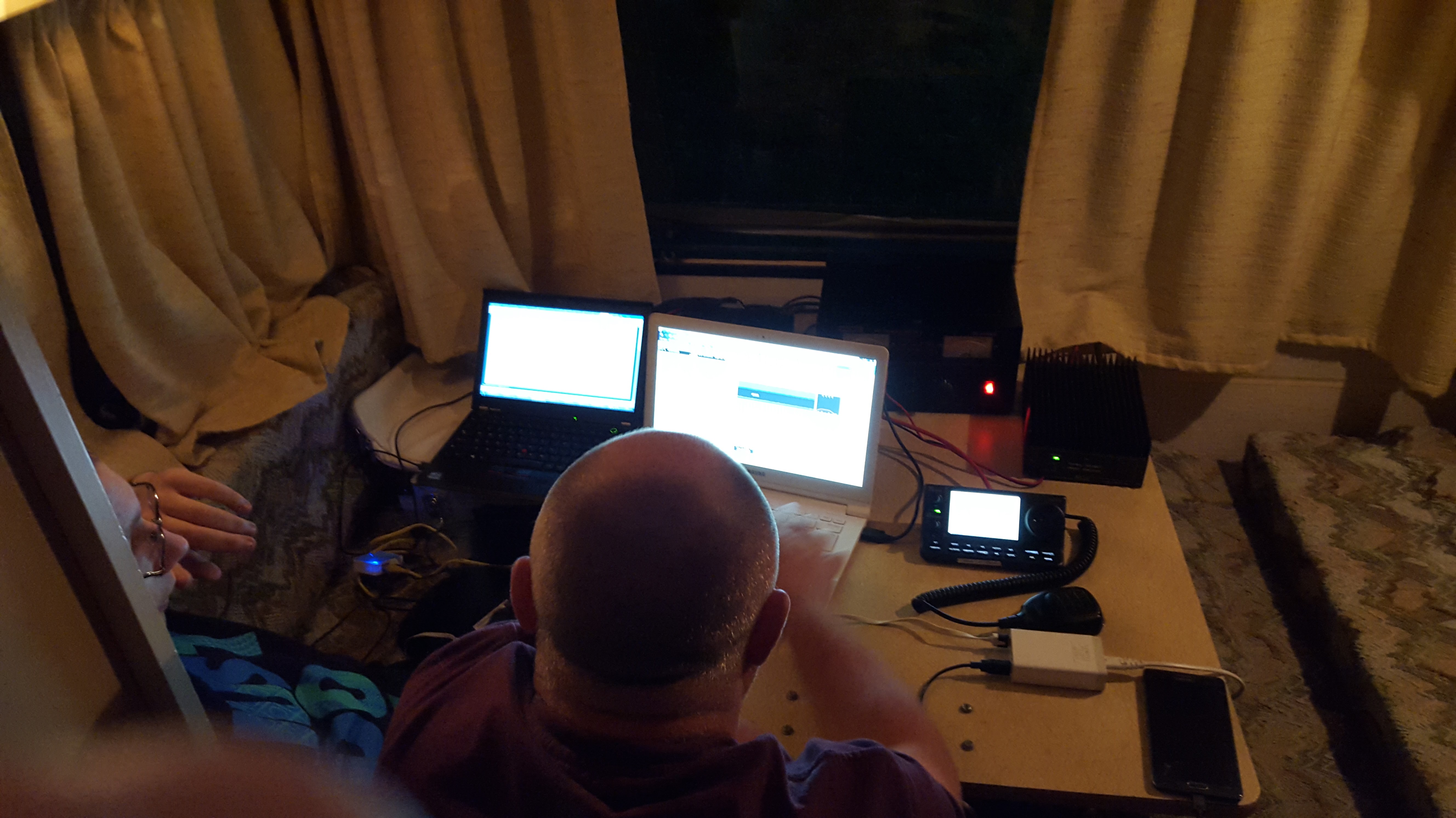 50 MHz and 70 MHz were run as a sub station. Again, using an Icom IC7100 transceiver and an InnovAntennas 6-element dual band (50/70MHz) yagi (7m AGL), with an 85 Ah leisure battery. The battery also provided mains power via a small inverter, which charged the logging laptops.