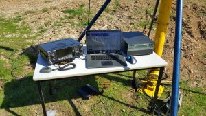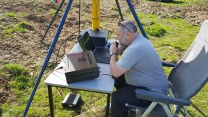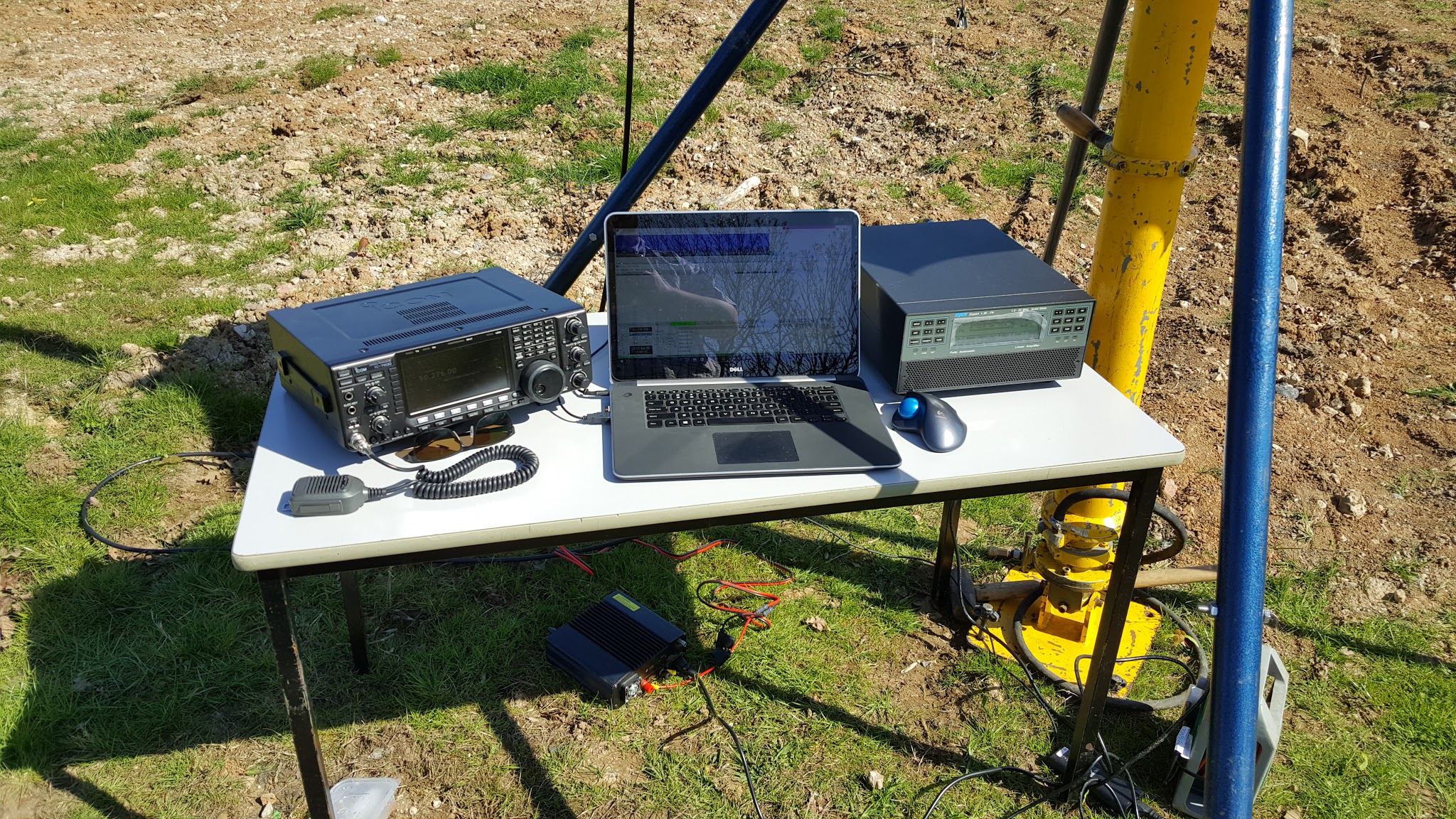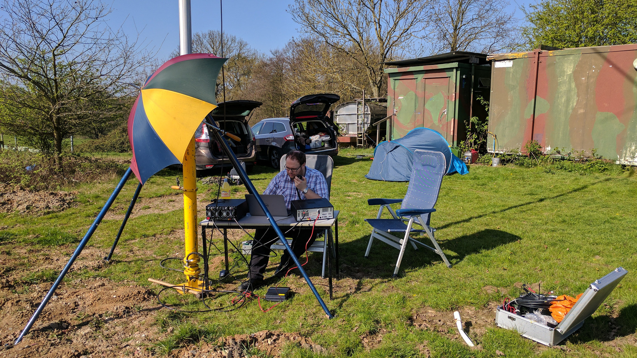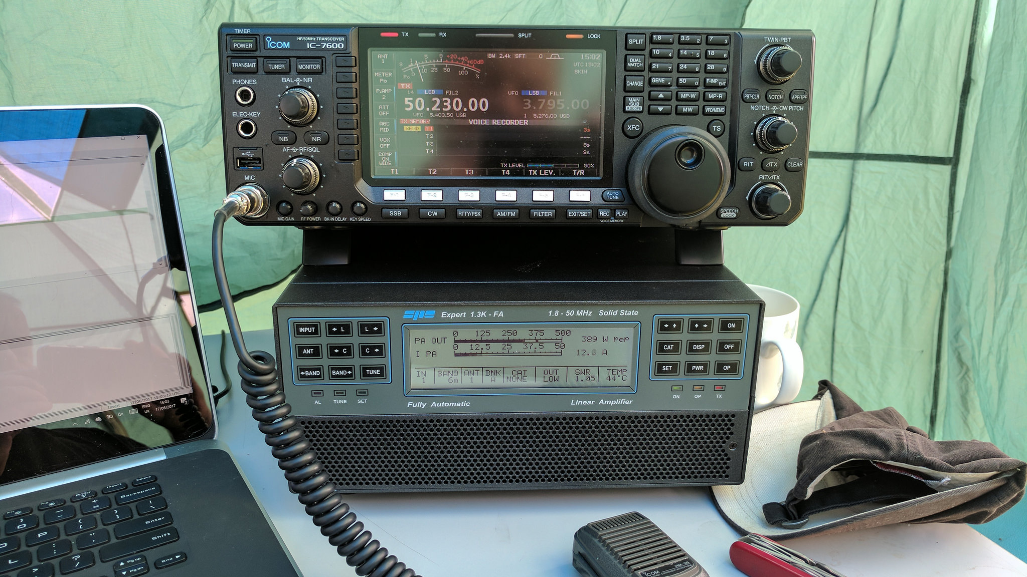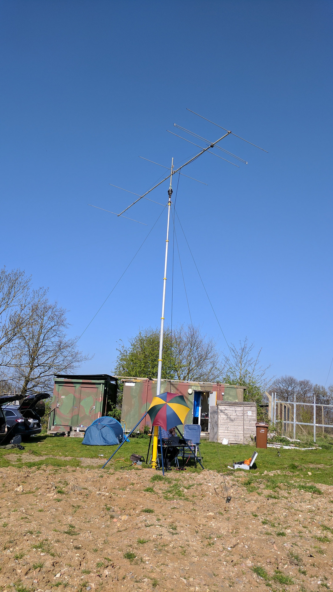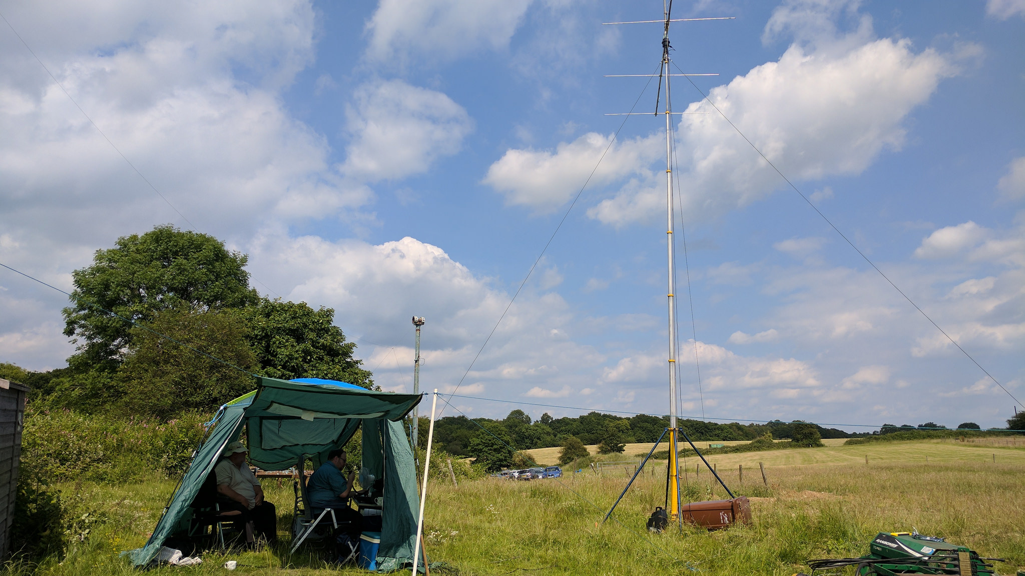 We set up on Saturday morning, using a 5 element 50MHz beam and a 10m pump up mast. A solid state amplifier provided 400W and a light weight tent to keep off the sun.